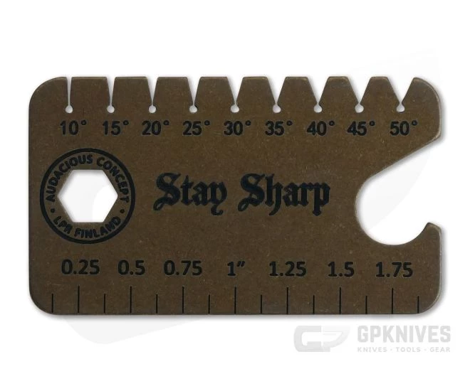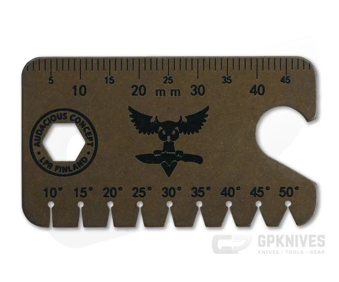 Finnish company Audacious Concept delivers a multi-purpose titanium dog tag with the 3rd generation V3 model featuring a keychain hole, standard & metric rulers, bevel gauge and a bottle opener. This is a lightweight tool perfect for finding your sharpening angle, measuring length of a small object, holding a standard ΒΌ” bit and opening your favorite beverage when your work day is done. This version comes with a Bronzed tumbled finish.