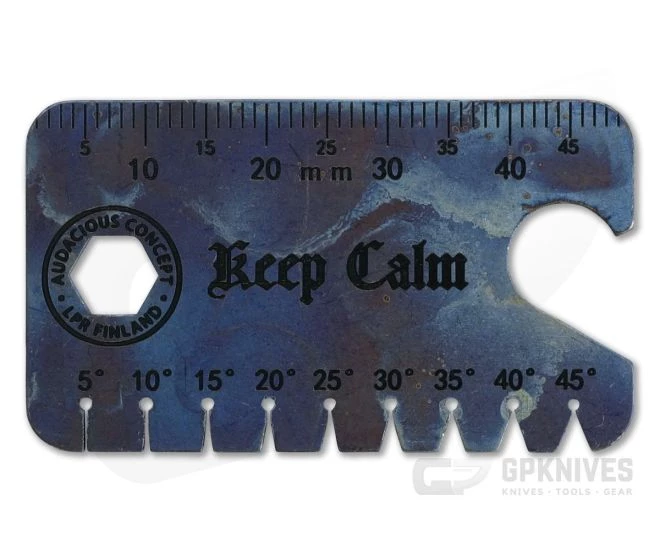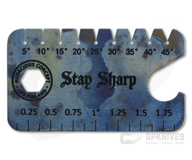 Finnish company Audacious Concept we have a multi-purpose titanium dog tag angle finder tool featuring metric and imperial rulers, hex bit holder & bottle opener. This is a lightweight tool perfect for finding your sharpening angle, measuring length of a small object, holding a standard ΒΌ” bit and opening your favorite beverage when your work day is done. This version comes with a tumbled, Flame anodized finish.