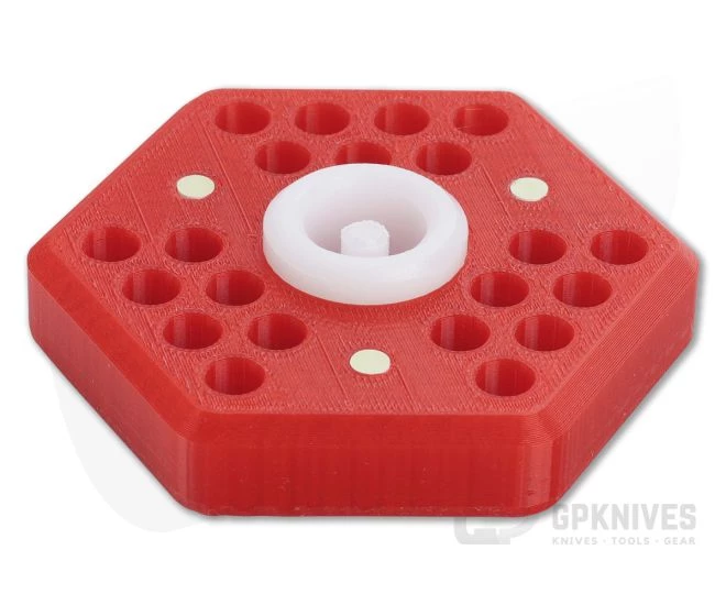 Made from durable, 3D printed red polymer with white center inset, the Hex21 desktop toolholder is a compact design built to hold a hex bit driver in the center surrounded by 21 bit holders. Unadorned except for the three glow-in-the-dark dots for low light indexing on the top, this red polymer version makes a great low maintenance and budget friendly option for driver and hex bit organization.