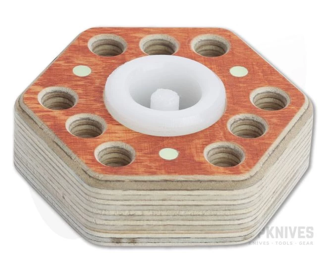 Made from high quality Birch plywood like the EDC organizer HexTray, the Hex9 desktop toolholder is an ideal option for smaller desks or other areas with limited space and is designed to hold a hex bit driver in the center surrounded by 9 bit holders. The bottom is engraved with the Audacious Concept Owl logo while the top sports three glow-in-the-dark dots for low light indexing. This version comes with raw edges and orange stained flats.