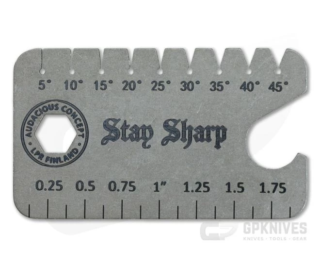 Finnish company Audacious Concept we have a multi-purpose titanium dog tag anglefinder tool featuring metric and imperial rulers, hex bit holder & bottle opener. This is a lightweight tool perfect for finding your sharpening angle, measuring length of a small object, holding a standard ΒΌ” bit and opening your favorite beverage when your work day is done.