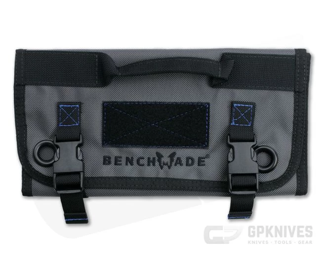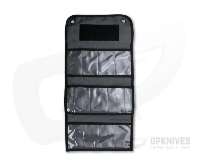 Made by The Last US Bag Company, the Benchmade Knife Roll is a great why to safely store your knives at home or on the go. The body is made of gray, high strength 1680 nylon with a protective urethane coating. Unclip the buckles to access the see-through pockets, enough to hold eleven knives and two pens. Large metal grommets on the front flap make hanging your roll easy. A gusseted design makes for a relatively small 12 x 6” footprint when closed.