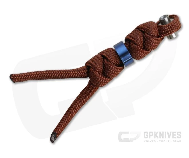 This Chris Reeve Lanyard is made for attachment to a Small Inkosi. Lanyards are tied with a snake knot using 5 strand paracord with a round titanium bead and attached to an Inkosi back spacer. Requires disassembly for attachment. This version comes in the rust color with a blue bead.