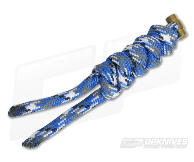 This Multicolored knotted lanyard featuring Bucky Blue and a Gold titanium pin is ready to attach to your Small Sebenza 21 knife. Some knife dis-assembly is required.