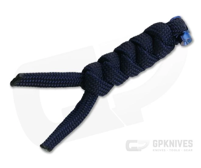 This Chris Reeve Lanyard is made for attachment to a Small Sebenza 21/31. Lanyards are tied with a snake knot using 5 strand paracord and attached to a titanium lanyard pin. Requires disassembly for attachment. This version comes in Midnight with a blue pin.