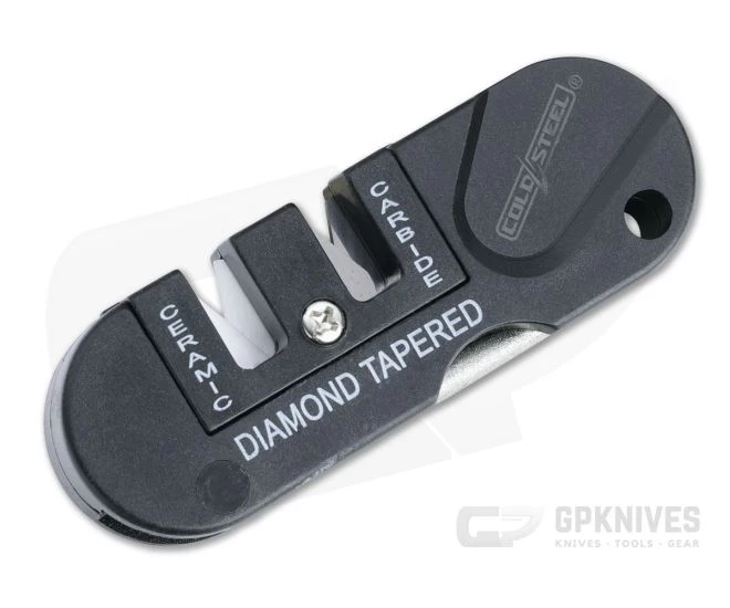 The Cold Steel Dual three-in-one pocket sharpener is simple, straightforward, and compact ready for use anywhere you need it. This pull-through style sharpener features a coarse carbide and fine ceramic for on-the-go edge maintenance and a tapered diamond rod for serrated edges.