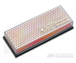 DMT Diamond Whetstone Sharpener with fine 600 mesh diamond. Steel molded over plastic base with diamond coating. Uses water for lubrication. Unique pattern reduces sharpening time. Includes instructions and plastic storage case.