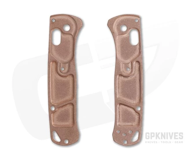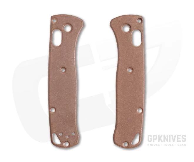 Upgrade your Benchmade Mini Bugout with the precision machined Copper Handle Scales by Flytanium. This set of two directly replaces the factory Mini Bugout scales for upgraded style and a more substantial in hand feel. Assembled weight tips the scales at under 4 ounces thanks to the internal milling. Finished in a stonewashed, ‘Antique’ patina, the scales have a rugged look and are machined with a single clip position for right hand tip-up carry.