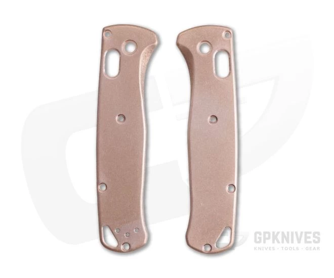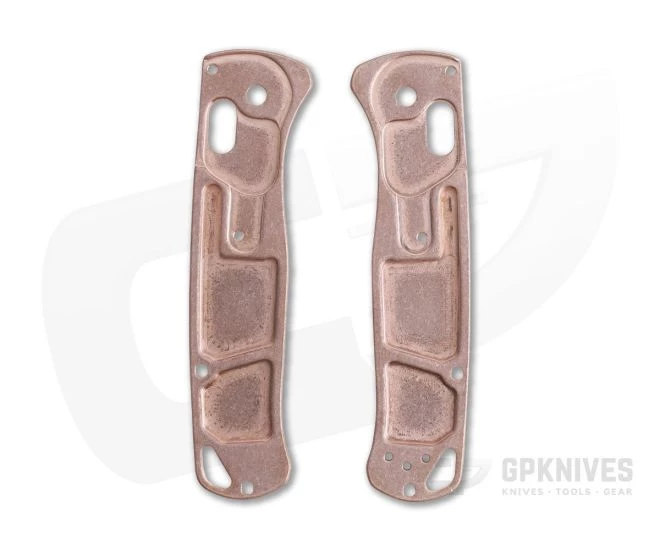 Upgrade your Benchmade Bugout with the precision machined solid Copper Handle Scales by Flytanium. This set of two directly replaces the factory Bugout scales adding character as well as a more substantial feel in hand. Assembled weight comes in just over 5 ounces. Solid Copper scales with antique stonewash finish. Single clip attachment point for right-hand tip-up carry.