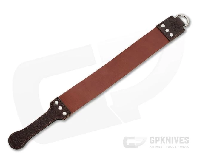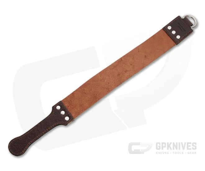 Great Eastern Cutlery Carbon Steel Licker Leather Sharpening Strop offers 11.5 inches (29.21 cm) of stropping surface at just under 2 inches (5.08 cm) wide to give that razor-edge finish on your traditional carbon steel knives. With the appropriate compound this strop will refine the edge of nearly any cutting tool. The thick leather handle and is beautifully tooled with acorns and oak leaves while the ring end is stamped with the Carbon Steel Licker emblem.