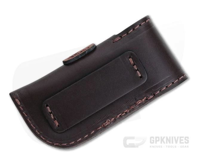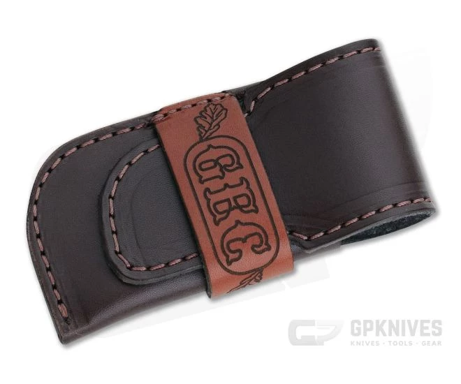 Small Folding Knife Belt Sheath made of Genuine Leather and tooled with the GEC or Great Eastern Cutlery logo on the front. Fold over flap construction with stitched belt loop on the back.