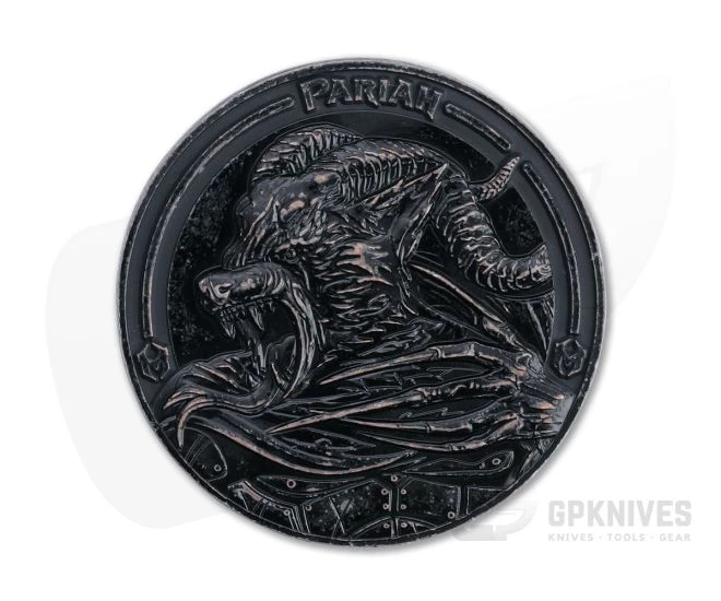 The Heretic Knives Pariah Challenge Coin features a stylized anthropomorphic cryptid ‘Pariah’ on one side and the Heretic Knives logo opposite. Each coin measures roughly 2 x 3/16″ and comes in a plastic storage case. This version has a tumbled “Battle Black” finish.