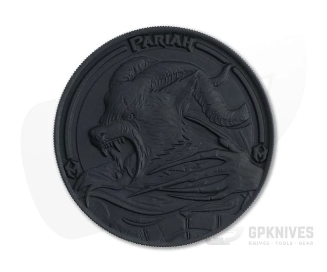 The Heretic Knives Pariah Challenge Coin features a stylized anthropomorphic cryptid ‘Pariah’ on one side and the Heretic Knives logo opposite. Each coin measures roughly 2 x 3/16″ and comes in a plastic storage case. This version has a flat “Tactical” black finish.