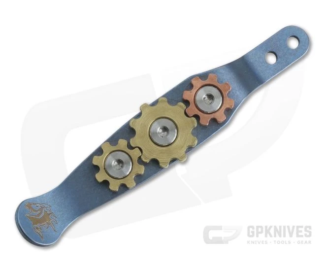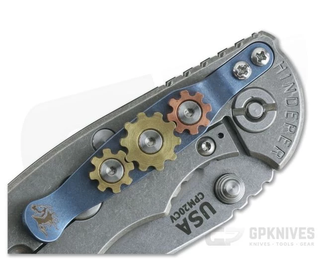 A perfect, fidget-friendly accessory for your Hinderer Knife is the Gear Clip with three fully functional gears mounted to the front of the classic, blue anodized titanium pocket clip. Made from copper and brass, two smaller gears flank a larger gear contrasting with the satin finished titanium hardware to deliver a visually appealing look. The clip end is laser engraved with the Hinderer Logo. This clip will fit all XM-, Eklipse and MP-1 models. Additional screws are not included. Gears will vary from clip to clip – Contact us for a specific configuration