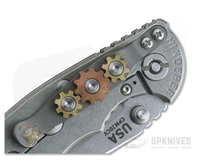 A perfect, fidget-friendly accessory for your Hinderer Knife is the Gear Clip with three fully functional gears mounted to the front of the classic, Working Finish titanium pocket clip. Made from copper and brass, two smaller gears flank a larger gear contrasting with the satin finished titanium hardware to deliver a visually appealing look. The clip end is laser engraved with the Hinderer Logo. This clip will fit all XM-, Eklipse and MP-1 models. Additional screws are not included. Gears will vary from clip to clip – Contact us for a specific configuration