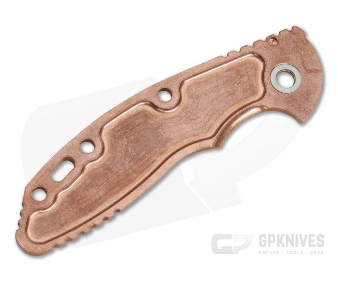 The Hinderer Knives Textured Copper Handle Scale is Precision CNC machined from solid, raw Copper to replace both the G10 scale and titanium liner on the XM-18 3.5″. Add your own style with a great heft in hand in a material that will form a unique patina through use over time. This scale is equipped with Hinderer-style 3D texturing for a secure grip. Includes steel pivot spacer (prevents wear) and instructions for installation with washers or bearings.