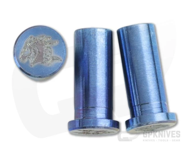 Customize your Hinderer Knives XM-24 4″ folder with Stonewashed Blue anodized handle nuts, each laser engraved with the Hinderer Knives Horse Head logo. Partial disassembly required for installation.