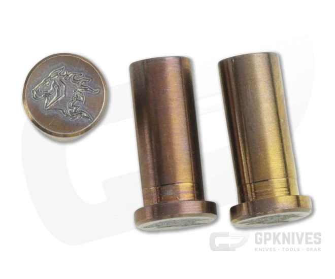 Customize your Hinderer Knives XM-24 4″ folder with Stonewashed Bronze anodized handle nuts, each laser engraved with the Hinderer Knives Horse Head logo. Partial disassembly required for installation.
