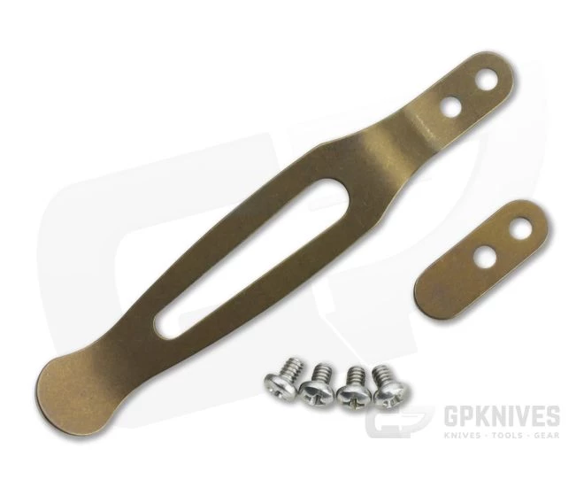 Made with precision by Hinderer Knives this machined titanium fits all XM series models, Eklipse and MP-1 knives. Made from quality US sourced titanium this set is a direct replacement for standard Hinderer clip and filler tabs. Each set includes one pocket clip, a matching filler tab and four screws. This Standard version has a single laser cut hole and stonewashed bronze finish.