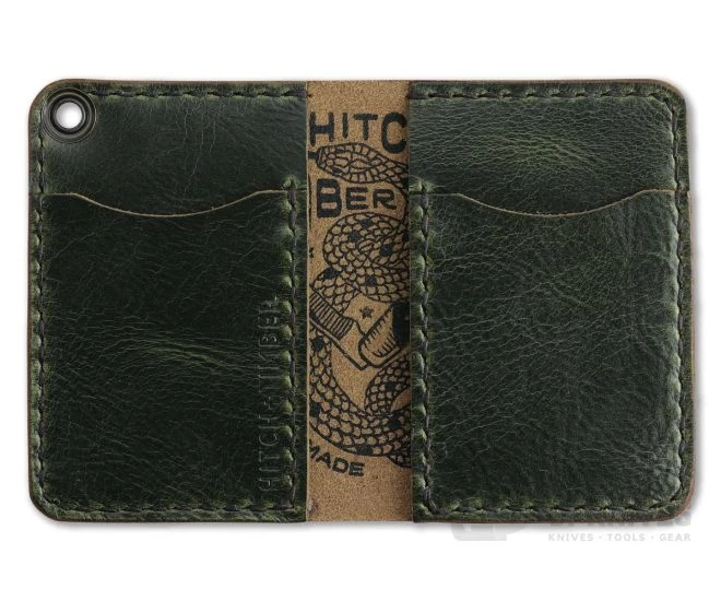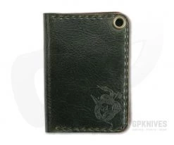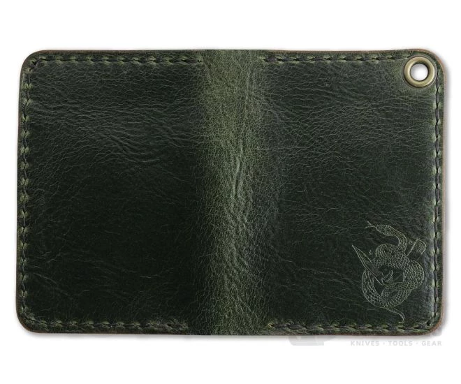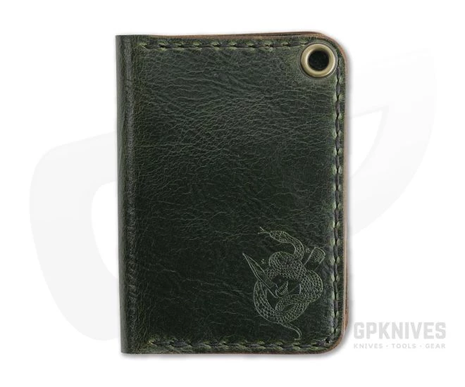 The Sheepshank Bi-Fold Wallet is a hand cut, stitch and burnished American made design with dual card sleeves holding 6-8 cards and two additional interior stash pockets for extra cash or receipts. Crafted with 4oz American tanned leather in Antique Green, the Sheepshank is durable for a lifetime of use that will only get better with age. The front is embossed with the Serpent & Blade logo. Due to natural variations in leather, there may be some differences in distress & color