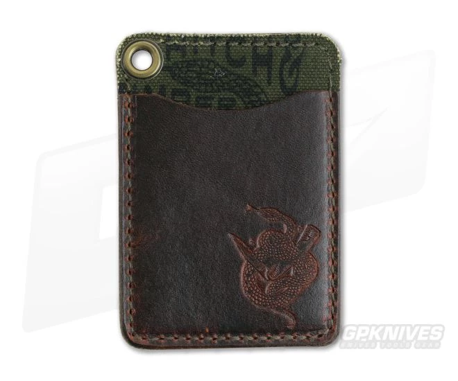 Cut, stitched and burnished with great care by human hands the Hitch & Timber Short Fold an EDC card wallet made from 4oz American tanned leather in Autumn Harvest color. The Short Fold is a minimalist card wallet built as the best option to keep comfortable with front or back pocket carry. Keep your everyday carry light with this simple American made leather wallet. The interior is back lined with a repurposed US military canvas stamped with Hitch & Timber’s traditional snake logo. The Short Fold wallet is equipped with a brass grommet for lanyard or other tool attachment.