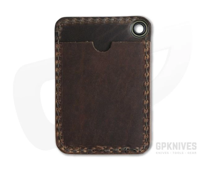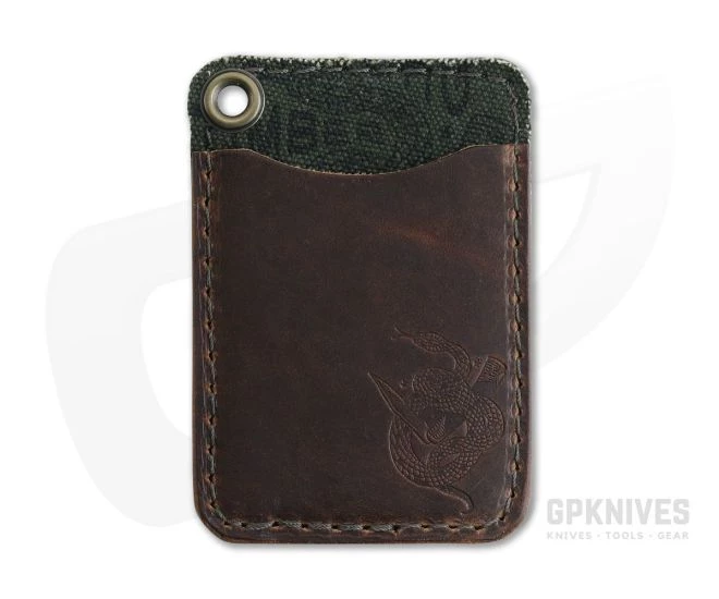 Cut, stitched and burnished with great care by human hands the Hitch & Timber Short Fold an EDC card wallet made from 4oz American tanned leather in Brown Nut color. The Short Fold is a minimalist card wallet built as the best option to keep comfortable with front or back pocket carry. Keep your everyday carry light with this simple American made leather wallet. The interior is back lined with a re-purposed US military canvas stamped with Hitch & Timber’s traditional snake logo. The Short Fold wallet is equipped with a brass grommet for lanyard or other tool attachment.