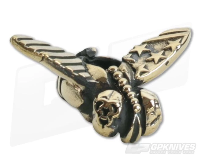 Custom made Brass Toxic Fly bead with bio-hazard eyes and US Flag wings made by Lion Armory in the USA. ≈1/4 inch diameter lanyard hole.