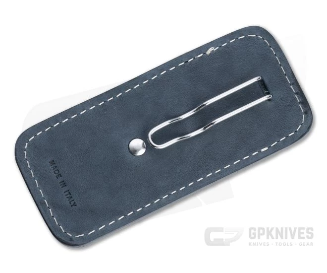 The LionSteel vertical leather sheath with steel wire pocket clip is an ideal choice for stylish carry of your small slip joint, back lock, or other non-clip equipped knife. It also works as a great slip for a small pen or flashlight. Made from high quality, sustainable (EMAS certified) vegetable tanned Tuscan leather sourced from the Genuine Italian Vegetable-Tanned Leather Consortium. This version comes in blue.