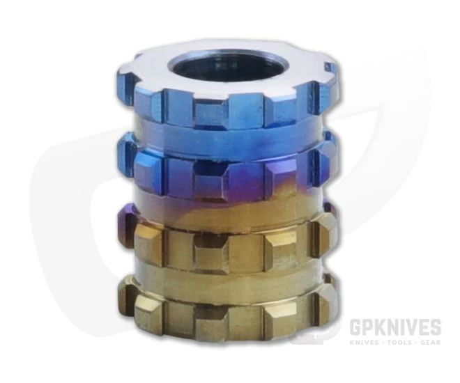 Casey Lynch of Lynch Northwest makes high quality titanium pocket clips and daily carry accessories. This is a multi-color fade anodized Short Grid titanium bead with 9-tooth cog milling. The bead is strung on a 2 mm cord lanyard and ready for attachment to your knife or other gear. The bead is guaranteed for Life.