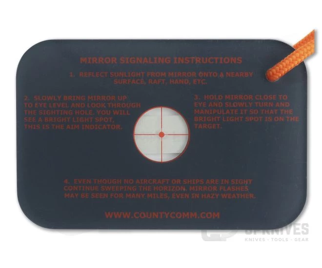 Coming in at under 1.5 ounces with its case and taking up less space than a smartphone, the CountyComm Compact Signal Mirror consists of a high quality second-surface reflective mirror produced by a telescope optics manufacturer sandwiched between dual layers of durable, lightweight composite material. The final product is about 3/16 inches thick and highly reflective, with a focused flash that can be seen for miles even in hazy weather. Instructions are conveniently printed on the back of the mirror. Includes orange paracord lanyard and Nylon TacSoft lined pouch.