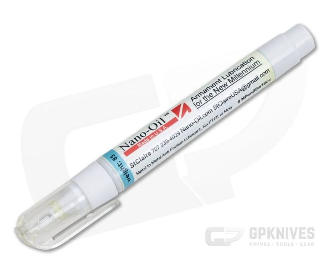 Nano-Oil by St. Claire is a Made in the USA Armament Lubrication for the New Millennium. This 85 weight CLP is the Heavyweight lube of the lineup and is catching on with many custom knife makers and enthusiasts. The NanoPen is a roller ball tipped pen that allows the oil to be applied in a drop, puddle or line with a press of the tip. Comes with click-top cap with clip. 0.5 fl. oz (14.79 cubic centimeters) volume.