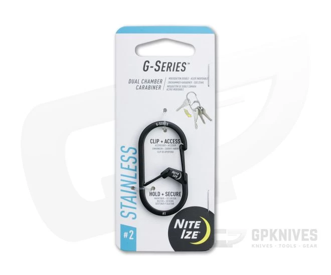 The Nite Ize G-Series are dual chamber carabiners built to secure your keys while allowing for easy key removal and safe carry. Assorted sizes let you handle any number of keys while keeping a minimalist profile. Load the keys into the first chamber then pass them through the gate into the second chamber for secure carry allowing the first gate to be used for attachment to belt loops, bags other key rings for versatile organization. This size #2 comes in matte black stainless steel.