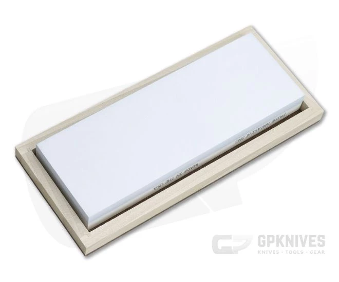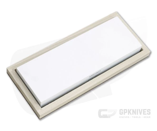 The 1000/6000 Dual Grit Pride Abrasive 8″ Aluminum Oxide Water Stone is made from high quality bonded aluminum oxide. The 1000 Grit is a good place to start for general sharpening when you don’t have edge damage and delivers a coarse edge for aggressive slicing on a plain edge blade. 6000 Grit is a fine finishing stone for general sharpening delivering a fine satin finished edge fast. This one comes with a high quality wooded box for display or storage.