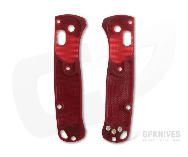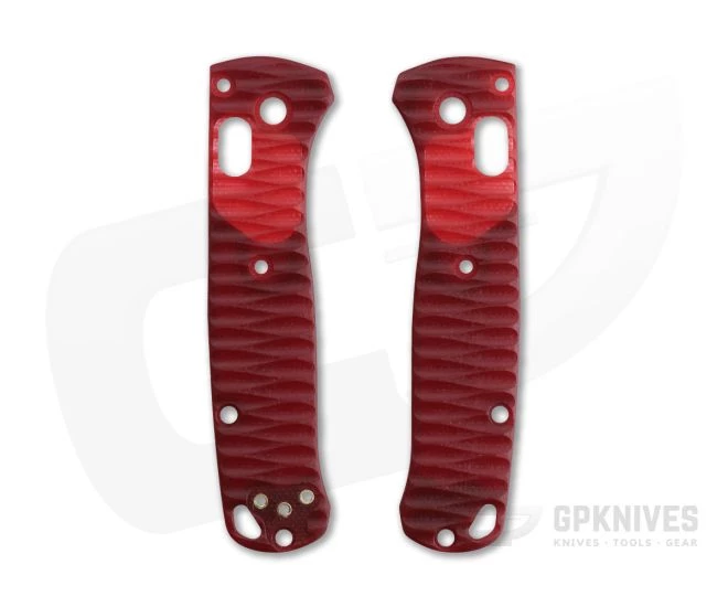 Custom-made handle scales with an Anso-style ‘Grooved’ pattern are milled to fit perfectly on your Benchmade Mini Bugout 533 folder. Included is one set of scales. No hardware or tools included. Use original hardware for assembly. Threaded brass inserts are set up for right hand, tip-up carry only. This version comes in red G10.