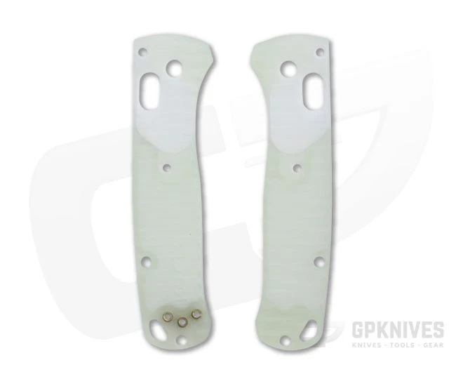 Custom-made handle scales with an Anso-style ‘Grooved’ pattern are milled to fit perfectly on your Benchmade Mini Bugout 533 folder. Included is one set of scales. No hardware or tools included. Use original hardware for assembly. Threaded brass inserts are set up for right hand, tip-up carry only. This version comes in Translucent Jade Green G10.