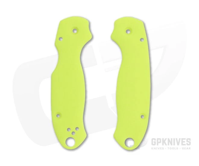 Custom-made Smooth Day Glow Yellow G10 handle scales are milled to fit perfectly on your Spyderco Para(military) 3 folder. Included is one set of scales. No hardware or tools included. Use original hardware for assembly.