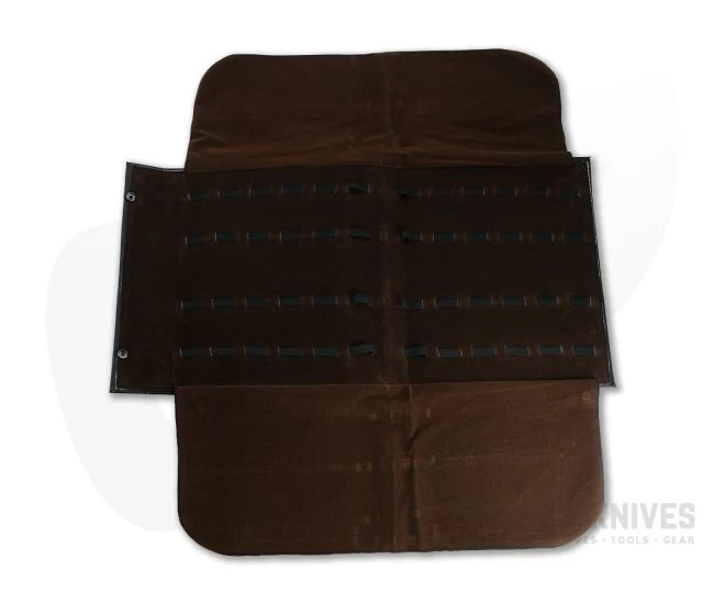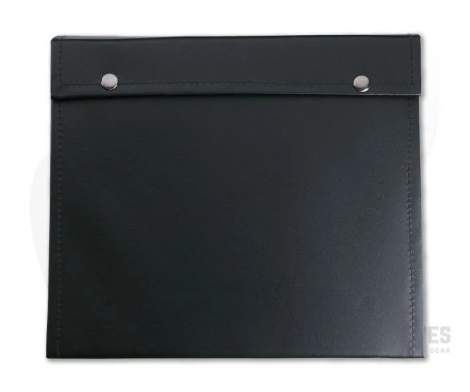 Safe and Sound Gear Folding Knife Pack holds approximately 24 knives. Durable vinyl cover with felt and cloth lining (colors vary). Double snaps for secure closure.