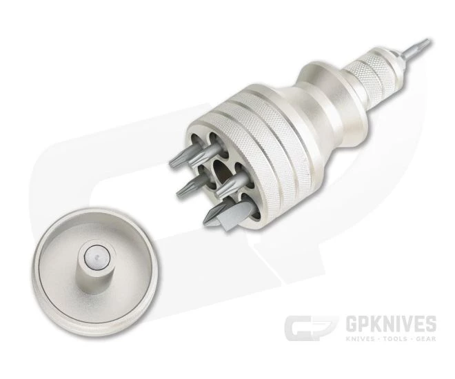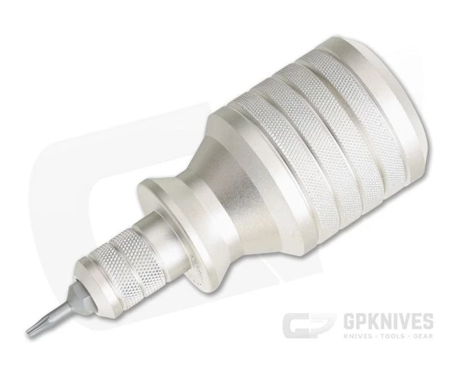 Designed for when a bit more torque is required, the Stubby Hex Bit Driver features a thicker grip that doubles as internal bit storage with quick access back to easily swap out bits. Machined from 6061-T6 Aluminum, this version is Silver Nickel Plated and features a magnetic 1/4 inch bit driver with precision knurling at the tip and high-torque knurling at the base. The magnetically attached base easily removes to reveal the 6-bit storage area. The Stubby Driver includes a set of 7 Wiha Bits: T6, T7, T8, T9, T10, PH#1 & SL4.5.