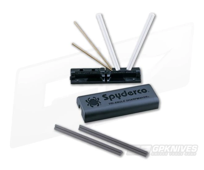 Spyderco Sharpmaker sharpening system. Our best selling sharpener, the tri-angle sharpening stones sharpen just about anything with ease. Set consists of two fine and two medium ceramic sharpening tri-angles which work with knives large or small, plain or serrated, fish hooks, tools, scissors and more. The Sharpmaker comes with two set angles, both 30 degrees and 40 degrees for either thick or thin profiled blades, and a 12.5 degree angle for sharpening scissors. All components fit neatly in a plastic base for easy storage or travel. Includes an instructional leaflet and DVD. Brand new item from Spyderco Knives.