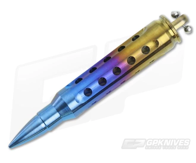 .223 Dangler in Rainbow Anodize Finished Titanium (transitions from light blue to bronze) by Steve Kelly of SK Knives. NRC compliant. Ready to accept any 3mm x 22.5mm insert. Simply twist the top and pop in your glow or Tritium vial! Comes with a beaded chain for key chain attachment, zipper pull or pack.