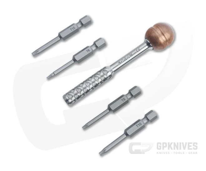 Steve Kelly’s Ti Connector side project produces high end titanium knife hardware and accessories. One of the newest additions to their line is the Screw-It Precision Driver. This ¼” bit driver accepts all standard ¼” bits. THe Screw-It comes equipped with and is designed for use with Wiha Power Bits and includes 4 Torx Bits: T6, T8, T10 and T15. The body of the driver is solid 6AL4V Titanium precision machined with fish scale texture for a secure grip. The ball is made of tumbled copper and, equipped with hi grade bearing, allow for smooth and effortless operation whether as a driver or fidget spinner. The ball is unique in that it is attached via a titanium screw making it fully removable for servicing or replacement.