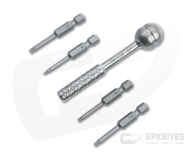 Steve Kelly’s Ti Connector side project produces high end titanium knife hardware and accessories. One of the newest additions to their line is the Screw-It Precision Driver. This ΒΌ” bit driver accepts all standard ΒΌ” bits. THe Screw-It comes equipped with and is designed for use with Wiha Power Bits and includes 4 Torx Bits: T6, T8, T10 and T15. The body of the driver is solid 6AL4V Titanium precision machined with fish scale texture for a secure grip. The ball is made of tumbled titanium and, equipped with hi grade bearing, allow for smooth and effortless operation whether as a driver or fidget spinner. The ball is unique in that it is attached via a titanium screw making it fully removable for servicing or replacement.
