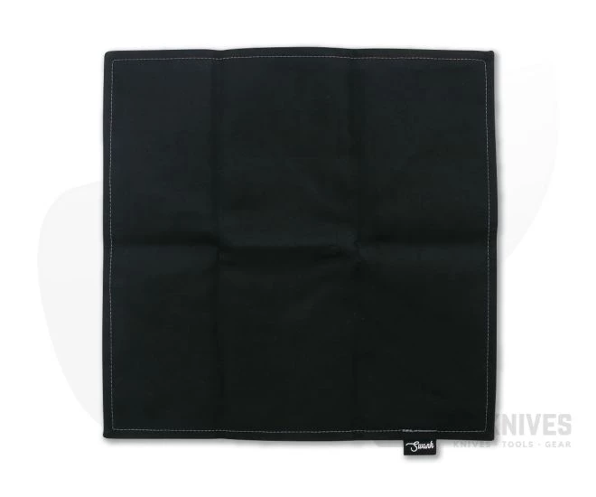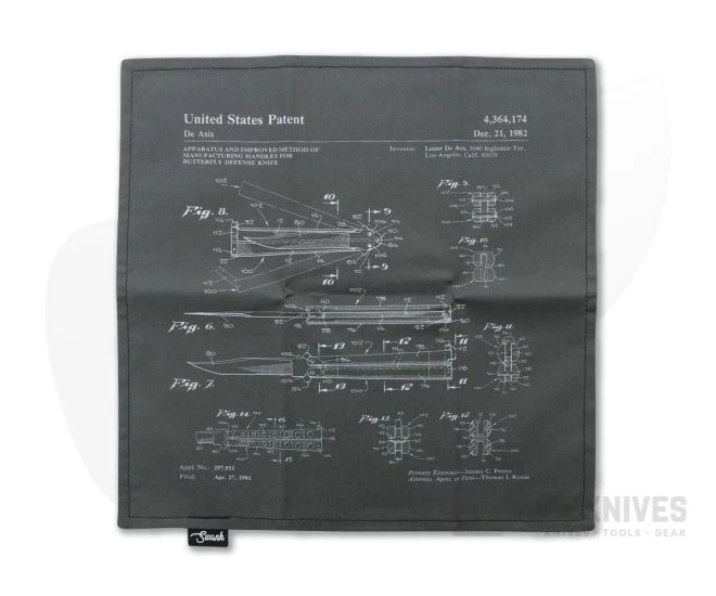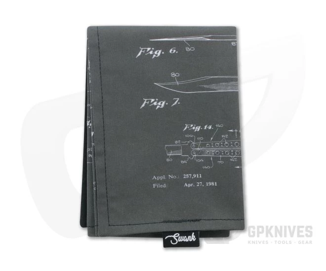 This custom, hand made hank from SwankHanks is made from high quality Kona cotton on the front and premium black microsuede on the back. The cotton is durable with a soft feel with a BalisongĀ Patent diagramĀ on the blackĀ cotton front. The microfiber backing offers added utility for cleaning glasses, device screens or other items finished with contrast stitching. A perfect lightweight addition to your every day carry.