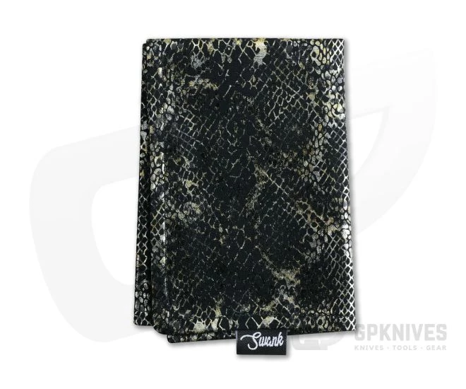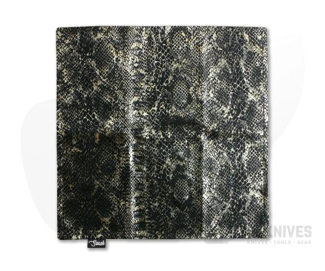 This premium, hand made hank from SwankHanks is made from quality cotton on the front and a high quality black microsuede on the back. The cotton is durable with a light texture and printed with a Metallic Gold Snakeskin over black cotton and black stitching on the front. The microfiber backing offers added utility for cleaning glasses, device screens or other items with contrast stitching. A perfect lightweight addition to your every day carry.