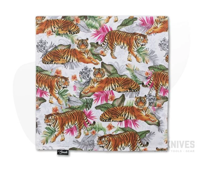 This custom, hand made hank from SwankHanks is made from high quality cotton on the front and premium black microsuede on the back. The cotton is durable with a soft feel with a “Tropical Tiger” design on the white cotton front. The microfiber backing offers added utility for cleaning glasses, device screens or other items finished with contrast decorative stitching. A perfect lightweight addition to your every day carry.
