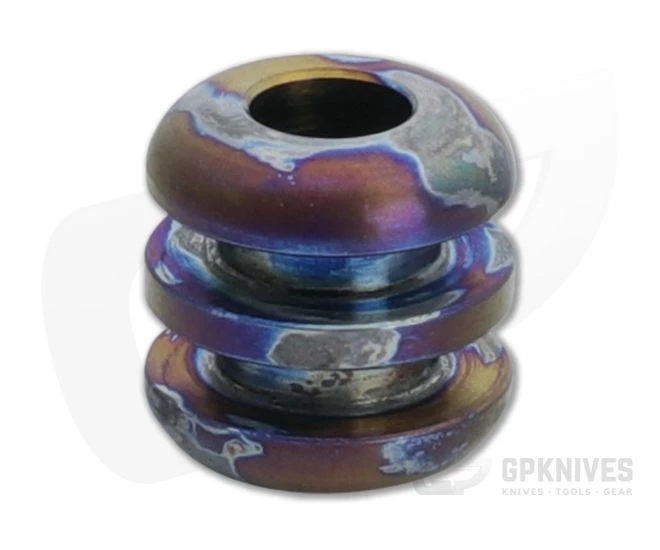 The Ti Survival three ribbed titanium lanyard bead made by Esteban Acosta makes an excellent addition to a knife or flashlight lanyard or for use as a zipper pull. The bead comes with Esteban’s “Blue Smoke” anodized finish. 1/4 inch diameter lanyard hole.