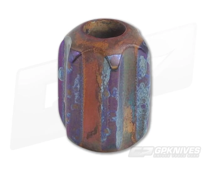 Ti Survival “Hex” XL lanyard bead made by Esteban Acosta. Hex beads have 6 vertically milled channels giving them a very sleek look. The bead comes with Esteban’s “Blue Smoke” anodized finish on the titanium high points with a patina-like finish on the copper ends and channels. 1/4 inch diameter lanyard hole.