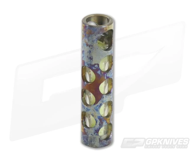Ti Survival Titanium Glow Lantern can be used to find things in the dark. Attach them to knife lanyards, keys, flashlights or zipper pulls for easy low-light location. These are made with commercial grade glow powder and can be charged with any external light source such as a flashlight or sunlight. Once charged they remain visible to the human eye in complete darkness for more than 24 hours however the initial intensity gradually decreases. This version has Estaban’s “Blue Smoke” multi-color anodized finish over a polished titanium body.