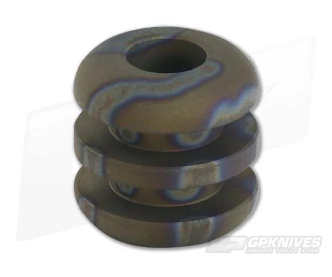 Ti Survival “Ribbed” lanyard bead made by Esteban Acosta. This is the Three Ribbed version and makes an excellent addition to a knife or flashlight lanyard or for use as a zipper pull. The bead comes with a sandblasted body with random flame anodized finish. 1/4 inch diameter lanyard hole.