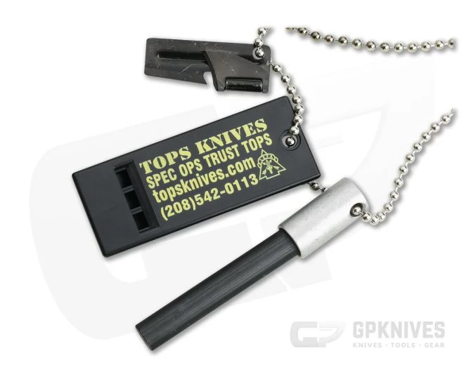TOPS Fire Starter Emergency Kit will start a fire, open a can and even work if previously submerged in water. The fire starter has 3 rods, two of which are magnesium and one of which is ferrocium. The magnesium rods are used to produce shavings that will burn at temperatures above 5,000 degrees Fahrenheit. The ferrocium rod will produce a molten hot 1,000 plus degree spark when struck to light the magnesium shavings. The three rods are housed in a 3/4″ aircraft aluminum machined barrel. Includes with the fire starter is a P-38 steel can opener and TOPS survival whistle. The fire starter, can opener and whistle can all be carried conveniently on the provided 30″ long ball chain.